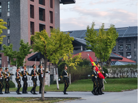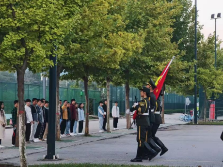 6时55分,国旗护卫队全员以饱满的精神面貌集合完毕,他们挺拔的身姿、坚毅的眼神向在场所有人诉说着他们此刻的荣耀。7时整,国护队的队员们迈着整齐有力地步伐,护卫国旗缓缓入场。当《义勇军进行曲》奏响,五星红旗在雄壮的歌声中冉冉升起,在场的每位师生都庄严肃立,深怀着对祖国无比的热爱和最崇高的敬意,向国旗行注目礼。