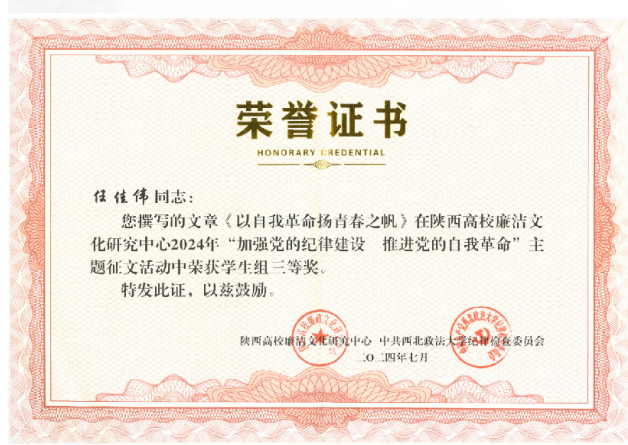 学生党员任佳伟所著《以自我革命扬青春之帆》论文,荣获学生组三等奖。