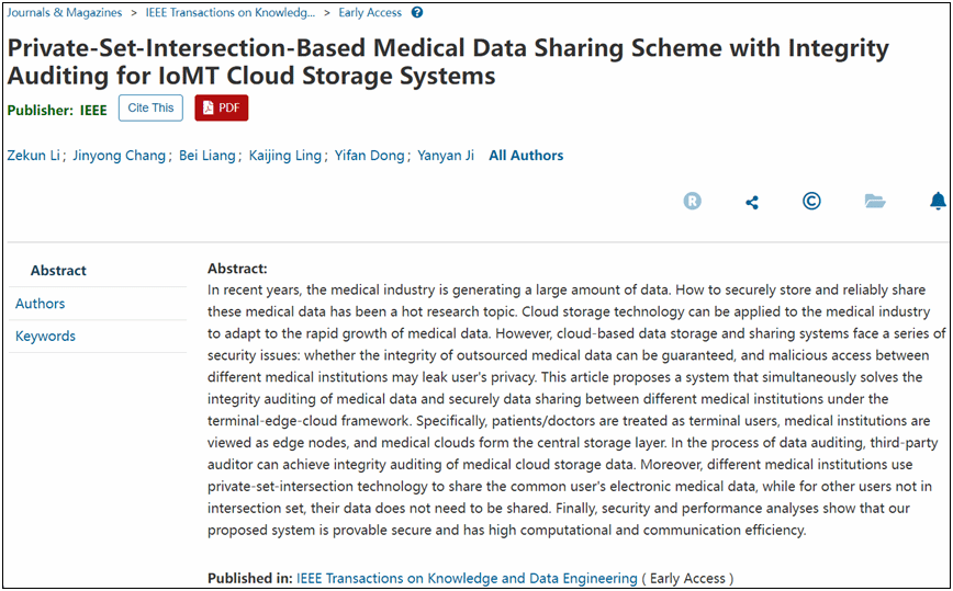 常金勇教授团队在国际顶级期刊IEEE TKDE(中国科学院SCI一区Top, 中国计算机学会和中国人工智能学会共同推荐的A类期刊,影响因子10.4)上发表题为“Private-Set-Intersection-Based Medical Data Sharing Scheme with Integrity Auditing for IoMT Cloud Storage Systems”(云存储环境下基于隐私集合求交的医疗数据共享与完整性审计方案)的学术论文。论文第一作者为我校硕士研究生李泽坤,通讯作者为常金勇教授,黑料不打烊