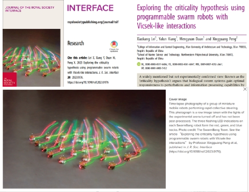教师雷小康博士团队研究成果“Exploring the criticality hypothesis using programmable swarm robots with Vicsek-like interactions”(使用可编程集群机器人在类Vicsek模型中验证临界假说)在国际著名交叉学科领域期刊《Journal of The Royal Society Interface》上发表,并被选为期刊封面。这是国际上首例基于真实集群机器人系统的临界假说验证实验,得到了审稿人的一致肯定。