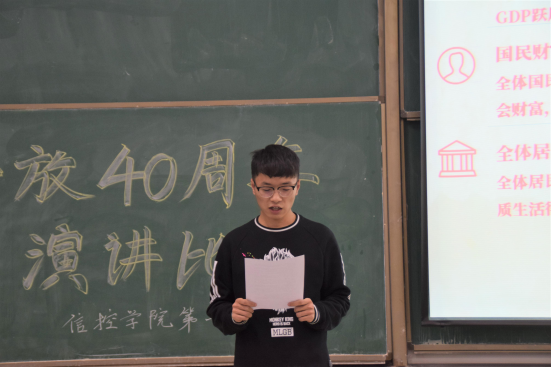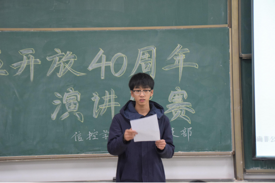 最后王凯同学发表演讲。他以《春天的故事》歌颂邓小平为引,引经据典,忆往昔,展未来,简洁明了地为大家呈现了他心中的改革之路,表达了他对祖国繁荣昌盛的祝福。