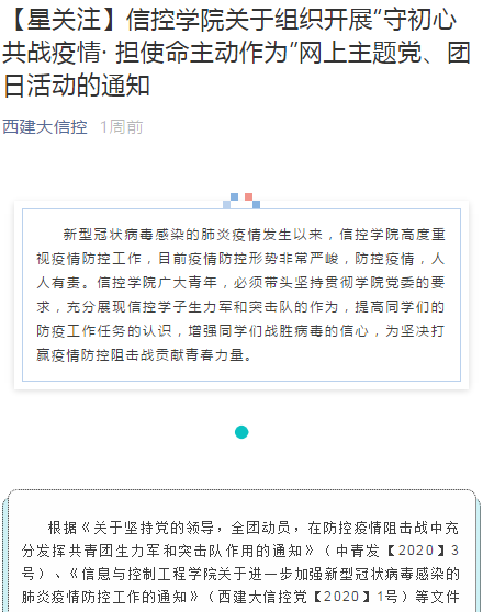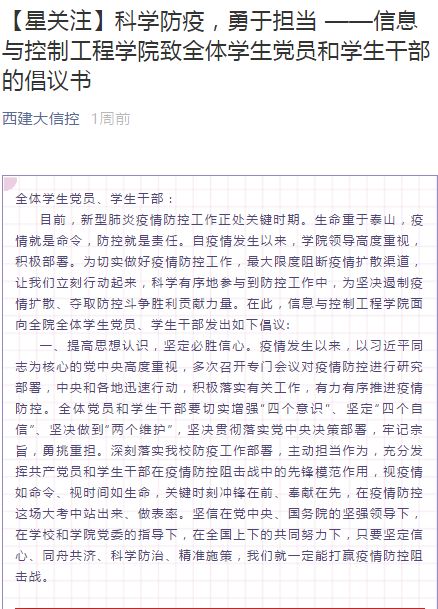 的学生党员通过线上自媒体平台向广大师生和家长分享防控手册、防疫攻略及辟谣信息,呼吁大家不信谣、不传谣,科学合理地做好防疫工作。学生本职是学习,学生党员带头做好了学习规划,带领同学们充分利用免费学习资源,主动进行自学,提前做好新学期学业准备和职业展望,积极准备各类创新创业竞赛,不断加强思想学习。特别针对大四及研三学生,积极组织和鼓励毕业班学生参加网络招聘,搭建就业服务平台。