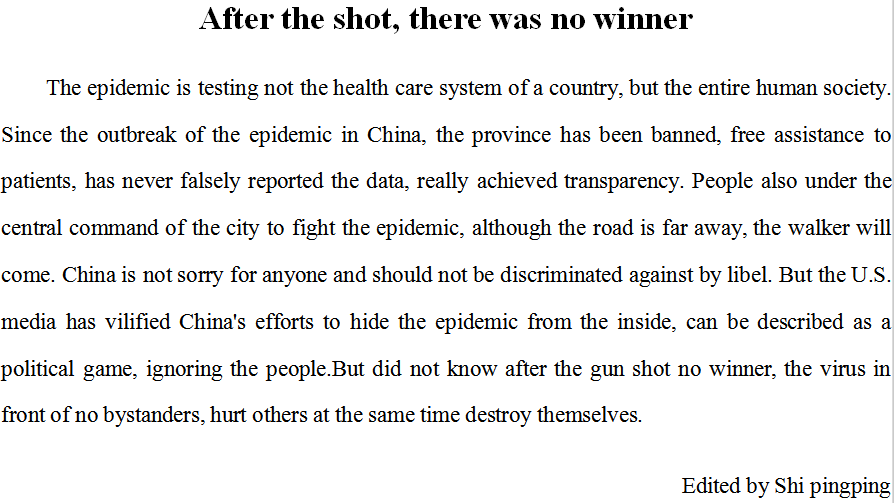 此次疫情考验的并非某个国家的医疗体系,而是整个人类社会。中国自疫情爆发以来,封省禁行,免费救助患者,从未谎报瞒报数据,真正做到了公开透明。百姓们也在中央指挥下众志成城抗击疫情,路虽远,行者将至。中国没有对不起任何人,不应该受到诽谤歧视。但美国媒体却对外诋毁中国就疫情做出的努力,对内隐瞒疫情,可谓醉心政治游戏,罔顾国民。殊不知枪响之后没有赢家,病毒面前没有旁观者,伤害他人的同时也在毁灭自己。