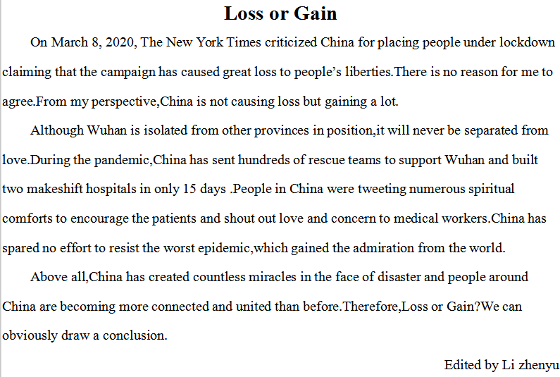 2020年3月8日,纽约时报就中国封城这一举措提出批判,声称此举给人民的人身自由带来巨大损失。对于这种做法,我绝不认同。在我看来,中国并不是在造成损失而是收获颇丰。