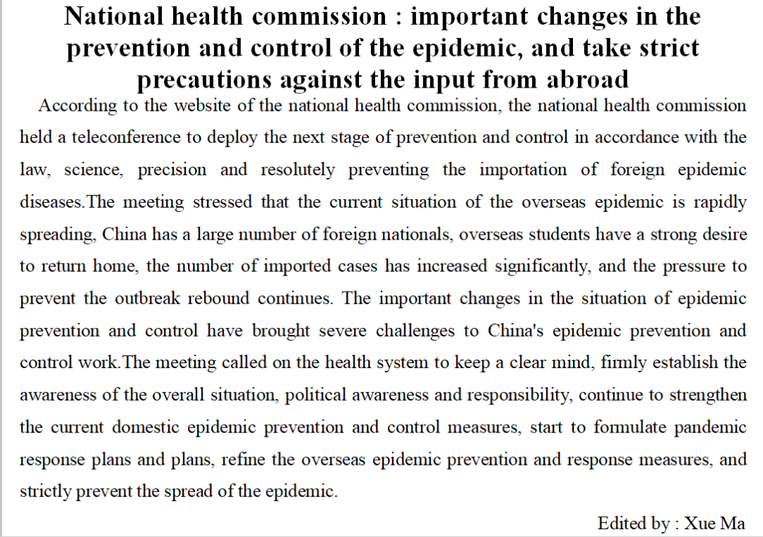 ② 作品:“国家卫健委:疫情防控出现重要变化,严防境外输入”