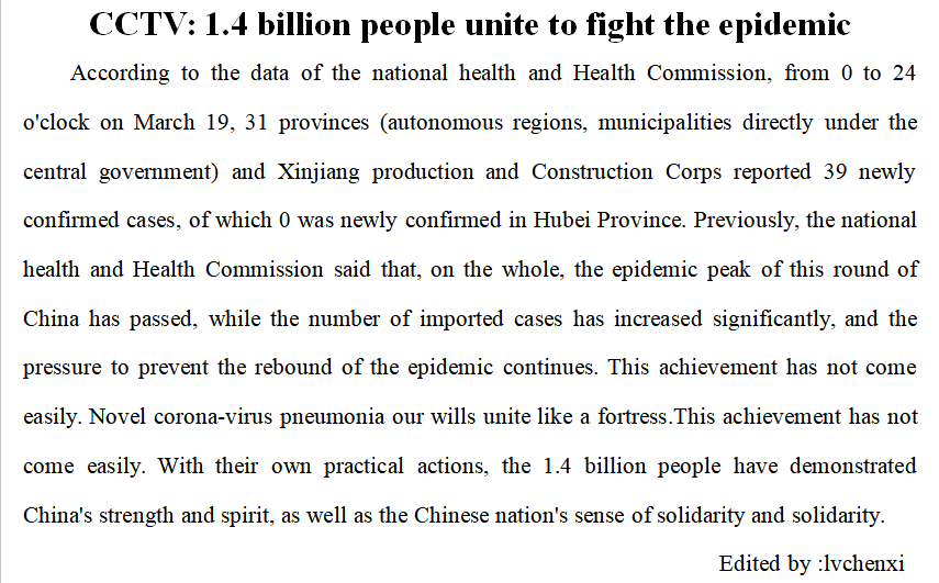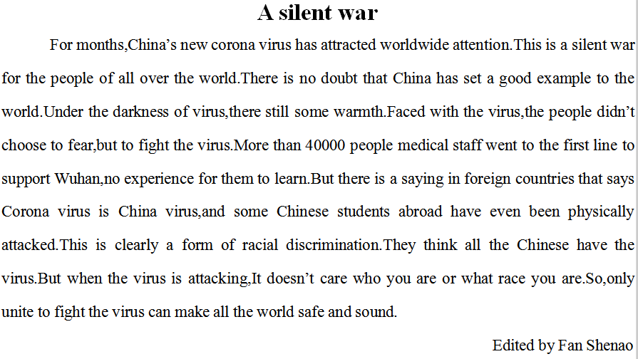 数月以来,在中国发生的新型冠状病毒引起世界瞩目。这是一场对全世界来说的无声的战争。但毫无疑问的是,中国为世界抗疫树立了一个良好的榜样。而且,在病毒带来的阴影下,依然可以看到一些光芒。面对疫情,人们没有选择恐惧,而是选择与病毒做斗争。超过40000余名医护人员第一时间到达武汉一线,没有任何经验可供他们学习。但是,在中国人民抗疫的同时,国外出现了一种声音,他们把冠状病毒称作中国病毒,一些海外留学生甚至遭到人身攻击,这无疑是一种种族歧视,他们认为所有的中国人都带病毒。但是病毒在感染时,是不管你是什么人的。所以,只有世界联合起来与病毒做斗争,我们全人类才能安然无恙。