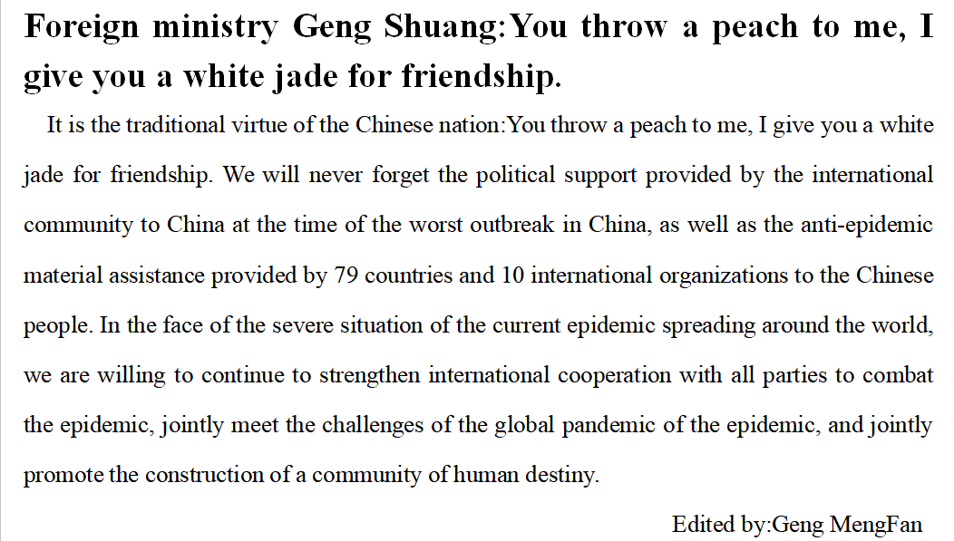 投我以木桃,报之以琼瑶,这是中华民族传统美德。我们永远不会忘记在中国疫情最严重的时候,国际社会对中国提供的政治支持,以及79个国家和10个国际组织为中国人民提供的抗疫物资援助。面对当前疫情在全球蔓延的严峻形势,我们愿继续与各方加强抗疫国际合作,共同应对疫情全球大流行的挑战,共同推动构建人类命运共同体。