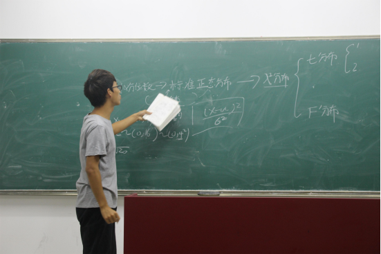 首先由王永鑫同学讲解数理统计方面的分布问题。他从逻辑关系和展开推理两个方面深入讲解了标准正态分布、t分布和f分布三种分布的情况。在讲完基础知识点后,他又从例题入手分析,更生动详细的完善了题目解析。短暂的休息后,梁晨曦同学为大家讲解了矩估计量和极大似然估计量。她将书上的步骤简化,用最主要的两步简洁高效的完成讲解。随后她又结合书本例题向大家仔细的讲解了不同题目的不同解法。同学们仔细听讲,并不时在笔记本上记录解题方法。在微课堂最后,同学们针对自己的薄弱点向参讲同学虚心请教,并在参讲同学的帮助下都对自己的薄弱点有巩固。