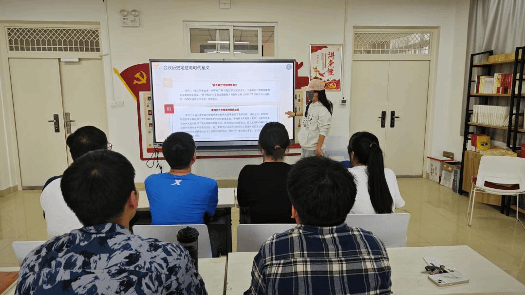 研究生会于信控楼709开展党的二十届三中全会精神研习活动,各部门负责人及学生代表参与会议,会议由研究生会蔚靖主持。