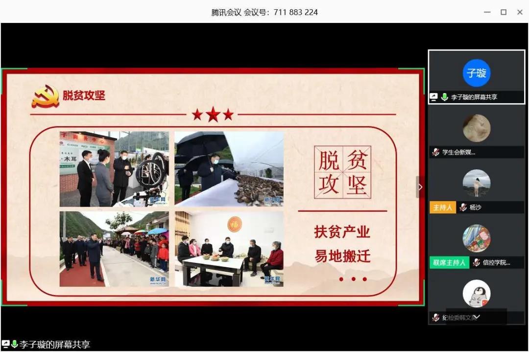 新媒体工作部部长,中共预备党员李子璇就脱贫攻坚、卫生防疫、义务教育、复工复产、西迁精神几个角度深入解读习近平总书记来陕考察重要讲话和重要指示精神,并阐述了西迁精神的核心与意义。