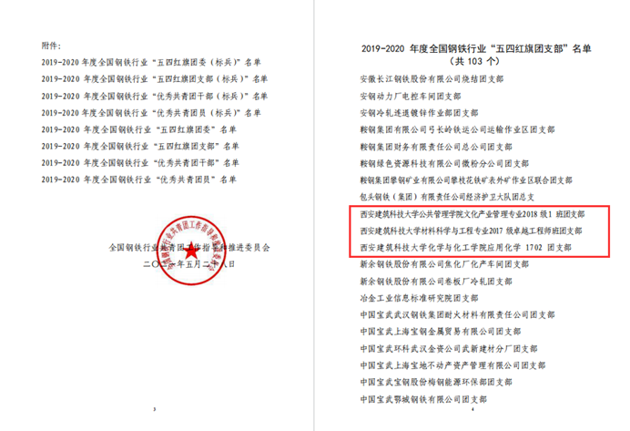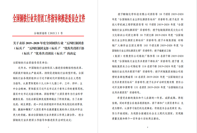 何晶晶同学被授予2019-2020年度全国钢铁行业“优秀共青团员”荣誉称号。