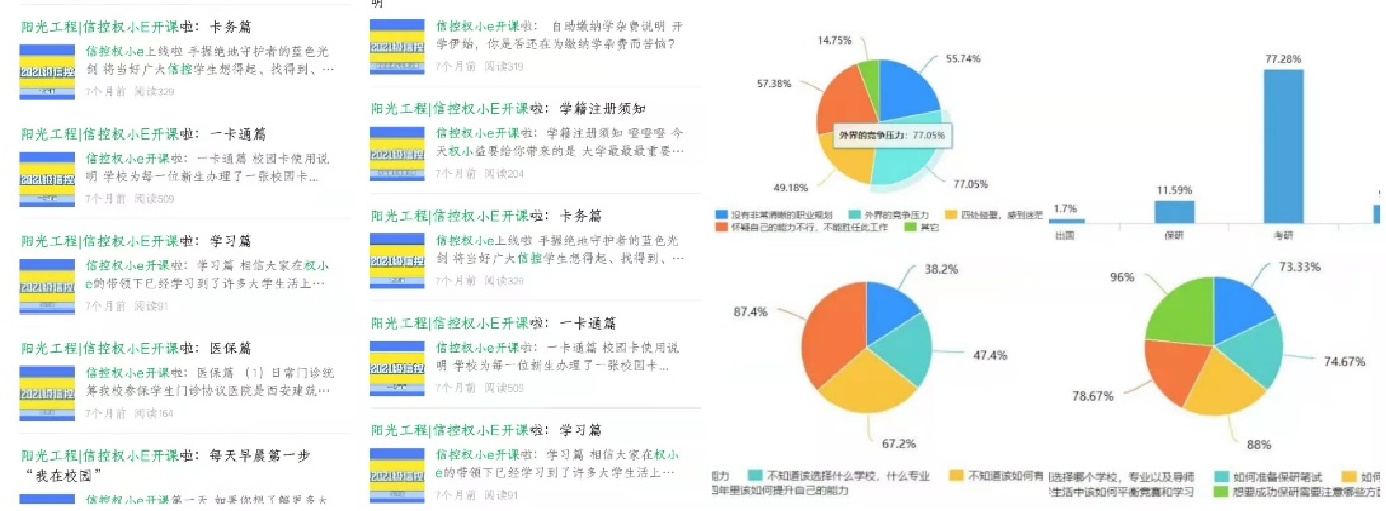 提升服务意识,勇担青春责任。院学生会开设权益品牌——信控权小E,出品学习、生活类指南9篇,收集有效校园生活类问卷累计填写人次达到2000人次,课程协调、失物招领等150余次。疫情期间,参与志愿服务655人次,服务时长累计1127小时,被陕西日报报道1人次,校级战疫青春报道5人次。