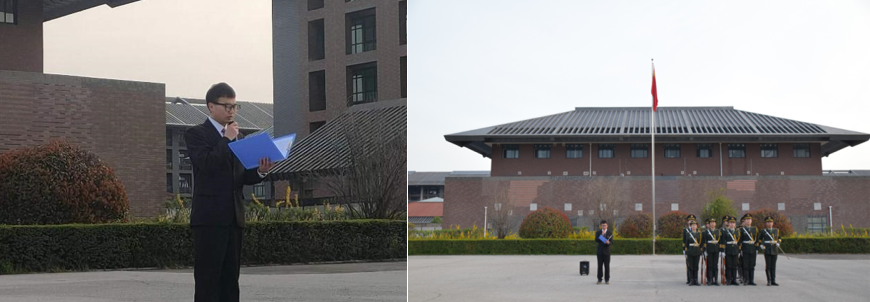 早上6:45,升旗仪式正式开始。金灿灿的朝晖,渐渐染红了东方的天际,国旗护卫队英姿飒爽,高唱军歌,迈着坚定而又整齐的步伐向着同学们走来。铿锵有力的口号、端正严整的军姿展现着国护队的神采与风姿。全体观礼人员庄严肃穆,面向国旗行注目礼,再一次让这神圣的时刻在心灵深处激荡。