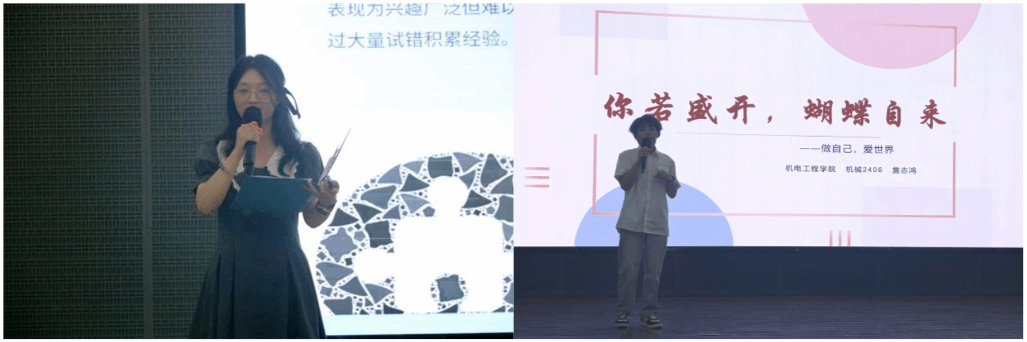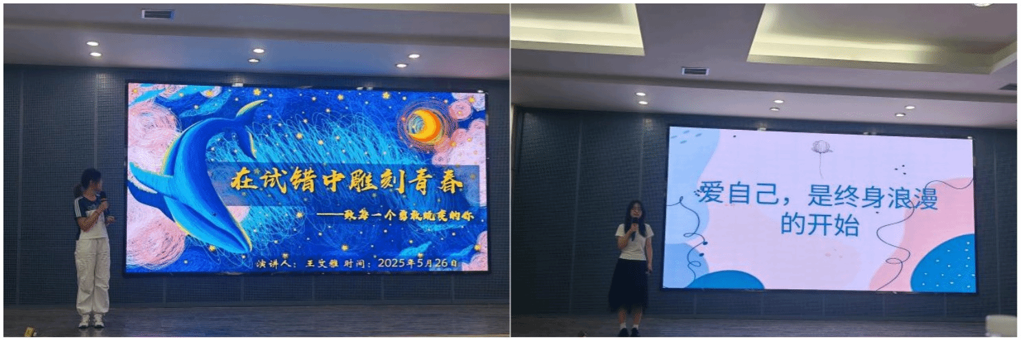 比赛中,选手们分别围绕“爱上自己,拥抱世界”、“我的大学”、“我想要的人生”主题,结合自身经历或身边故事,从不同角度诠释了对情绪管理、人际关系、自我认知、大学生活、成长规划等话题的理解与感悟。选手们以真挚的情感、生动的表达和富有感染力的演讲,引发了现场观众的强烈共鸣,台下掌声不断。