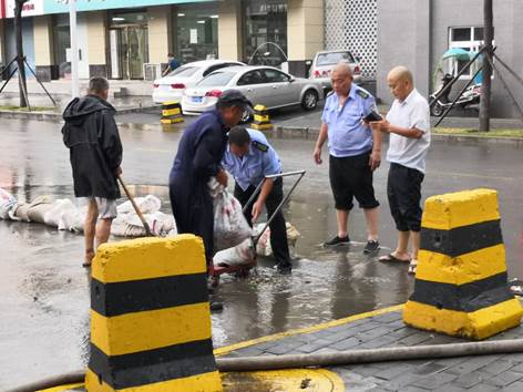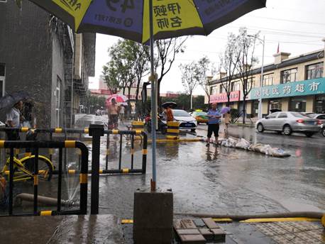 26日当天天气不太稳定,上午温度较高,室外人流较少,在下午1:00左右天气转阴,到2:00时开始下雷阵雨,许多人为了避雨会前往超市或直接回家。因雨势过大,道路积水过多,物业工作人员在小区门口前进行紧急防水,小区住户也前去帮忙。在此期间人流状况会有明显波动,这也充分说明了室外环境对时效性调研的影响巨大。突发的雷阵雨也不会影响于瀚文、田紫怡两人的统计调研进度,他们在和小区门卫沟通好后坐在门卫室继续统计人流状况,得到了在特殊天气下的调研数据。