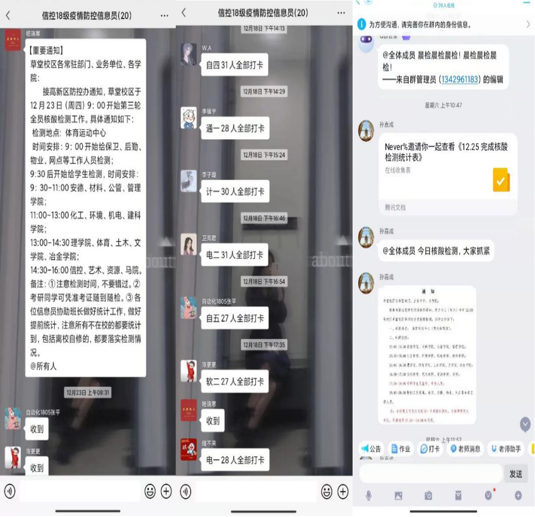 与此同时,本支部成立疫情防疫信息员,主要负责每天的健康监测,督促同学及时参加核酸检测,构建疫情防控网,助力疫情防控。