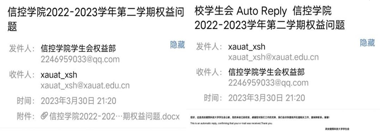 日常权益问题与学生们的生活息息相关,对此学生会权益部十分重视。2023年3月25日,权益部开会讨论了如何让学生们的权益得到保障和落实的问题,并收集整合了邮箱所收集的权益问题,并定期将收集到的权益问题反馈给校学生会。