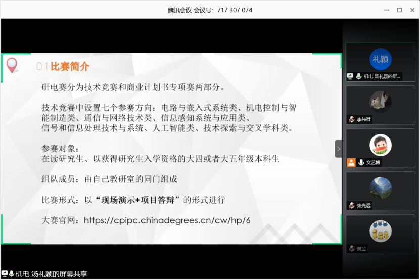 为深入贯彻我校《研究生教育综合改革总体方案》,进一步激发我校学生创新创业热情,营造浓厚的创新实践育人氛围。黑料不打烊 积极承办第十五届中国研究生电子竞赛黑料不打烊 校园宣讲会,校内选拔赛由党委研究生工作部、研究生院、创新创业办公室主办,黑料不打烊 承办,校研究生会协办。宣讲会于2020年5月20日14点30分通过腾讯会议平台举行。本次宣讲会邀请的嘉宾有黑料不打烊 学工办主任、研究生辅导员顾欣老师、管理学院的王倩同学、机电学院的汤礼颖同学。