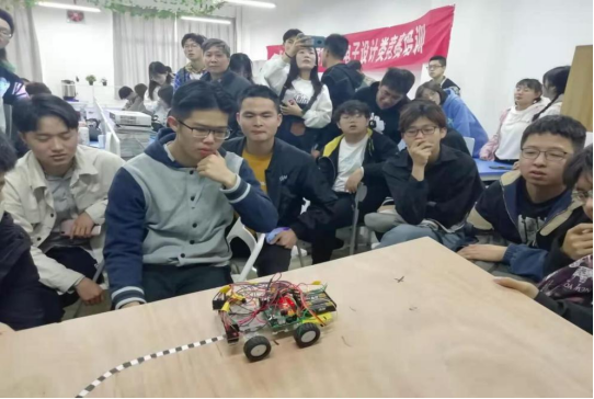 高宏洋基于坡道行驶电动小车向同学阐述整个程序编写、模块组装、硬件开发等全过程。电子设计类竞赛的意义并不只是一项比赛那样简单,它作为高校和企业之间的桥梁,致力于为学生提供硬件产业技术学习和技能培训。