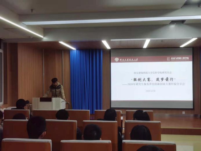 研究生会于2020年12月18日晚19:00在信控大楼606报告厅组织开展了“服创大赛,筑梦前行”服务外包创新创业大赛经验分享会,本次分享会由学术科技部的屈文景同学主持,并且特邀在第十一届中国大学生服务外包创新创业大赛竞赛中获得全国三等奖的孙世冲同学分享了竞赛的经验。