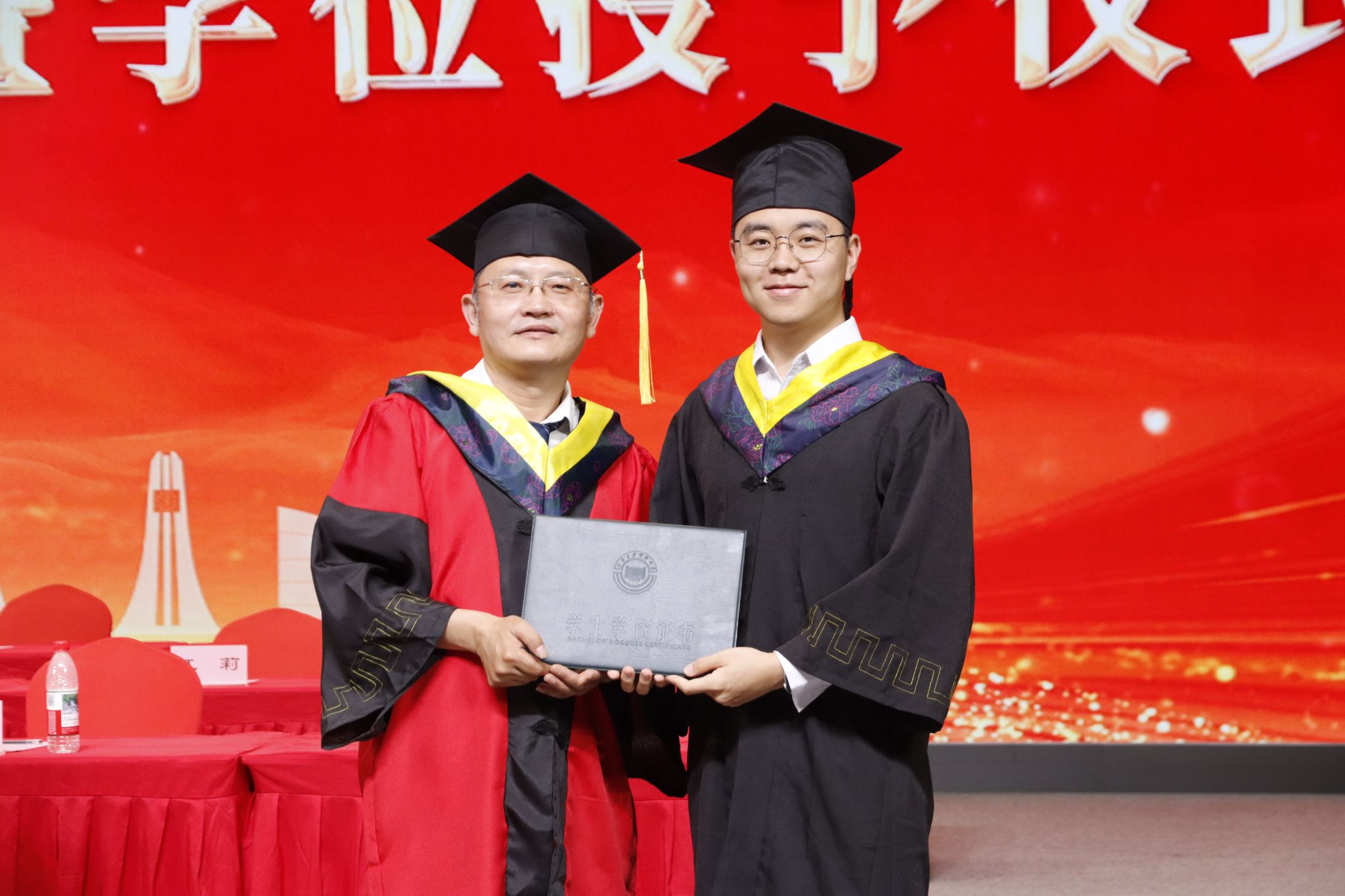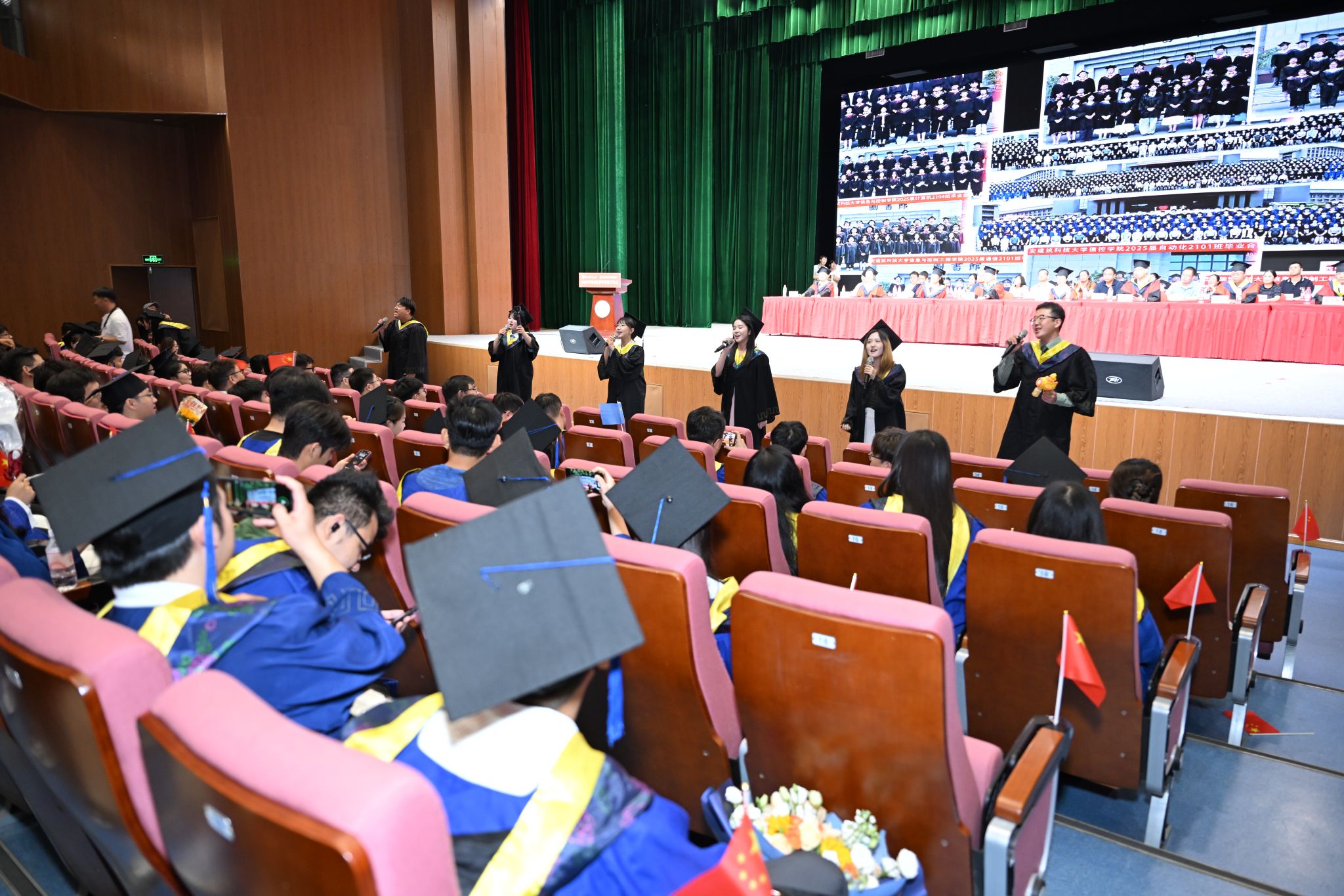 毕业典礼在毕业生代表的合唱《一路同行 逐梦启航》中落幕。学位授予仪式随即举行,学院学位委员会马宗方教授、王慧琴教授、嵇启春教授、边根庆教授为毕业生拨穗授位,合影留念。