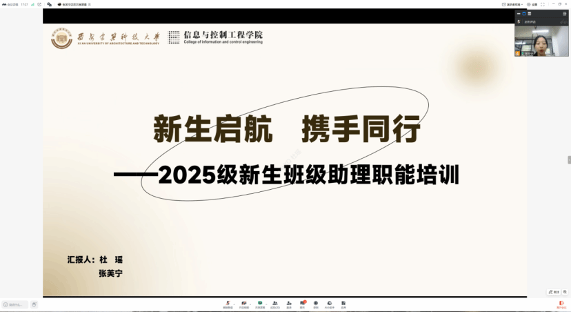 于8月21日17:00线上召开2025级班级助理职能培训。本次活动由2025级本科生辅导员杜瑶、张芙宁主持,全体新生班级助理参会。