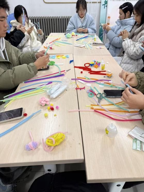 活动以一段轻慢舒缓的音乐帮助同学们清空思绪,放下考试焦虑,快速进入专注当下的状态,这一环节契合了心理疏导中“情绪锚定”的基础要求,帮助学生实现身心初步放松。随后通过扭扭棒制作教学视频,详细讲解弯曲、扭折、连接等关键手法,为零基础的同学扫清创作障碍。在悠扬的旋律中,同学们自主挑选心仪的扭扭棒颜色,通过缠绕、揉捏、扭转等动手操作,在沉浸式创作中释放内心压力,将备考阶段的焦虑情绪转化为手工创作的动力,亲手“编辑”出独属于自己的萌趣小马,打造了专属于个人的“情绪扭扭乐”。创作过程中,大家还会轻声交流制作心得,让言语互动与手工实践共同成为情绪释放与疏导的有效载体。