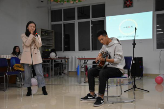 茶话会正式开始,首先王栋和大家分享了他在建大读研求学期间的有趣经历,并向2019级研究生新生同学表示热烈欢迎。随后由徐静冉和王赟同学为大家带来歌曲《一块红布》,优美的歌声为茶话会拉开了精彩的序幕。“逢七过”、“无敌破坏王”、“小偷抢凳子”等小游戏很好地活跃了会场气氛,大家十分享受轻松愉快的环境,会场笑声连连。接着,三位辅导员也上台演唱了令人倍感温馨亲切的经典歌曲《光阴的故事》。刘可立、田莹、傅彦茹三名同学带来歌曲《给我一首歌的时间》,她们用动听的女声完美演绎了这首歌。接下来王嘉怡、王钜文同学带来了弹唱《慢慢喜欢你》,动听的歌声、优美的旋律引来了现场一片掌声。伴随着王钜文同学演唱的《恋爱ing》,同学们的热情也随之达到了高潮,现场充满了欢声笑语。