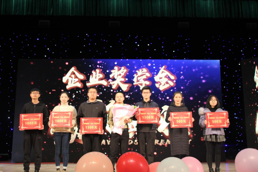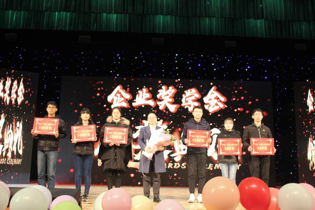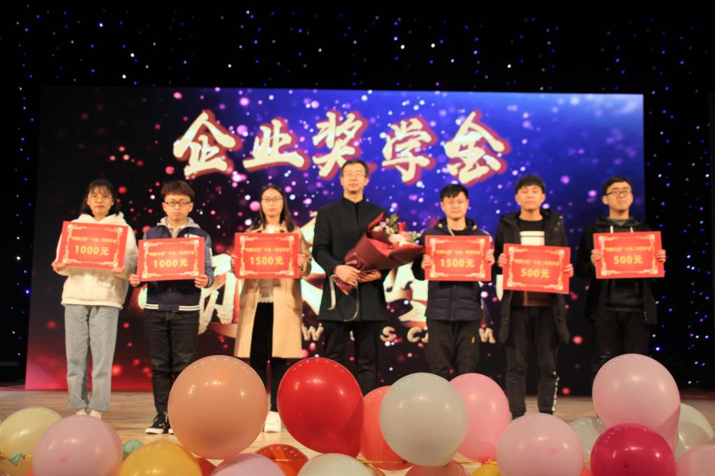 获奖者与优秀标兵VCR后,首先由西安华众电子科技股份有限公司董事长姚定江及席菲燕为获奖同学颁发“华众”奖学金,随后西安尚观科技西安分公司经理赵飞、运行总监王荣同校企合作经理池万虎一同颁发“尚观”专业奖学金,获奖同学依次上台领奖并合影留念。紧接着,由“尚观”专业奖学金获得者陈帅超上台发言。他向同学们讲述了自己大学的奋斗史,分享了自身在学习竞赛方面的总结经验,并鼓励同学们好好学习。最后,由西安欧朋互联科技股份有限公司副总经理王挺伟颁发“欧朋互联”专业奖学金,全体成员一同鼓掌祝贺获奖同学。