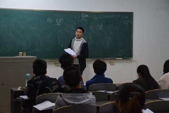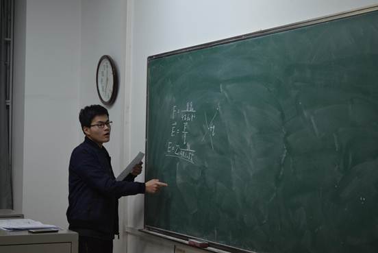 紧接着由龙永富同学对电磁场一章进行讲解。他开门见山,直接为同学们列举出要求掌握的公式,划出重点。简单讲解公式理解之后,以一公式一例题的形式展开讲解。他思路清晰,讲解流畅,其间同学们积极提问,积极配合。