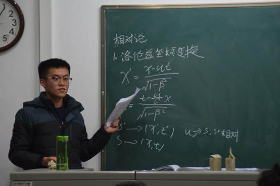 第二日的课程中,首先由赵凯江对课本相对论和量子力学两章节进行知识点梳理和例题讲解。他先带着全体同学勾画强调书中重点,并为同学们在黑板上板书归纳出重点公式,又详细讲解了公式的理解和应用,为同学们梳理知识点框架。知识点归纳完毕,他列举了多个例题进行详细讲解,归纳出试题题型,进一步加深了同学们对知识点的理解和把控。