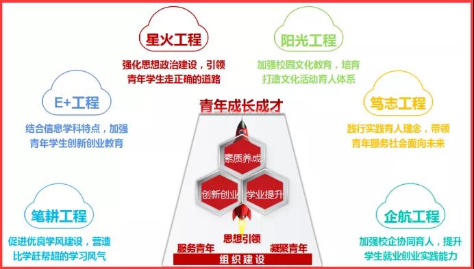 以此工作思路为主体,统筹构建“一体六翼”工作格局,围绕“六翼工程”(星火工程、笔耕工程、E+工程、阳光工程、笃志工程、企航工程)培养新时代全面发展的信息类人才。以“星火工程”为载体强化思想政治教育,引领青年走成长的正确道路;以“笔耕工程”为载体促进优良学风建设,营造比学赶帮超的学习风气;以“E+工程”为载体结合信息学科特点,加强青年学生创新创业教育;以“阳光工程”为载体加强校园文化建设,培育打造文化活动育人体系;以“笃志工程”为载体践行实践育人理念,带领青年服务社会引领未来;以“企航工程”为载体加强校企协同育人,提升学生就业创业实践能力。学院团委坚持以“一体六翼”工作格局为引领,围绕中心,服务大局,带领全院青年凝心聚力、开拓进取,不断推动学院共青团工作创新发展。