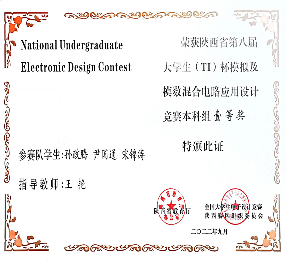 2022年8月,在由全国大学生电子设计竞赛陕西赛区组委会组织的陕西省第七届大学生(TI)杯模拟及模数混合电路应用设计竞赛中,我校学子获省级一等奖1项、三等奖2项。