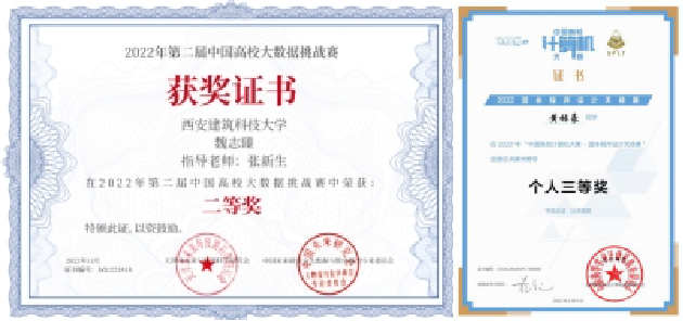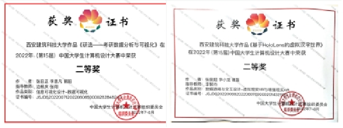 2022年10月,在由教育部高等学校计算机类专业教学指导委员会、教育部高等学校软件工程专业教学指导委员会、教育部高等学校大学计算机课程教学指导委员会、教育部高等学校文科计算机基础教学指导分委员会、中国教育电视台联合主办的中国大学生计算机设计大赛中,获的国家级二等奖6项、国家级三等奖8项,省部级一等奖15项、二等奖26项、三等奖25项,获西北赛区“优秀组织奖”。