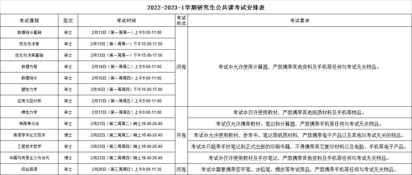 近期研究生公共课考试安排如下所示,请同学们相互转告,持研究生证或校园一卡通准时参加考试,严格遵守考试相关要求。具体考场安排见附件。