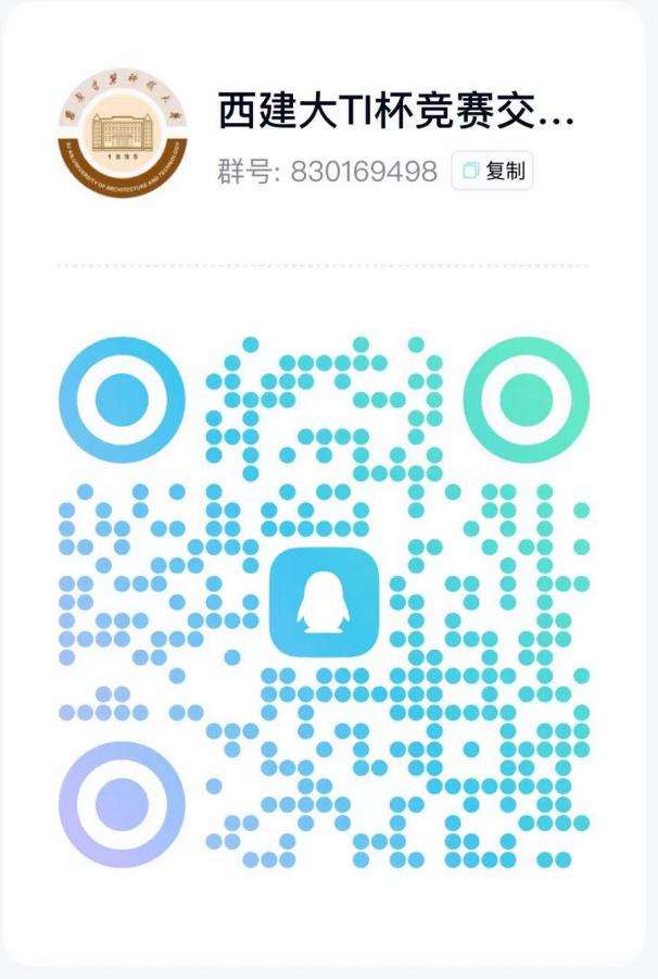 请参赛者加入西建大TI 杯竞赛交流QQ群:830169498(群二维码见下图),有关大赛工作的重要通知和说明事项将会在QQ群里公布。