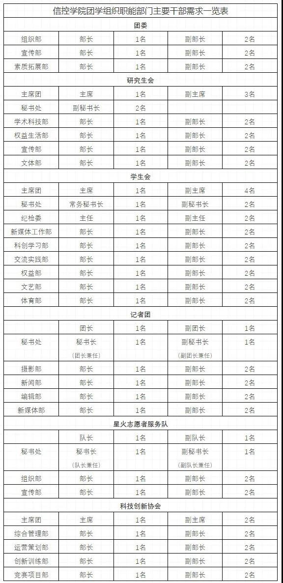 团学组织职能部门主要干部需求一览表