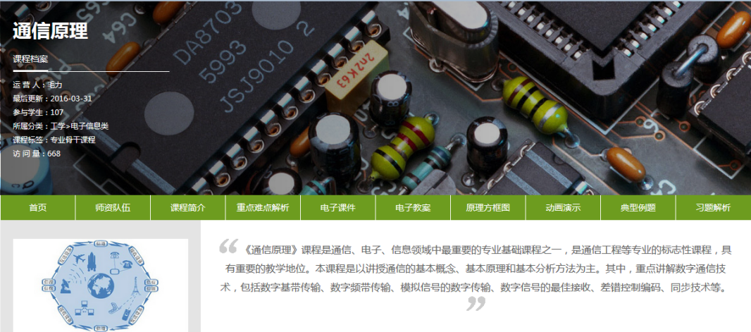 搭建核心课程的网络教学平台,将各种优质教学资源整合在这个平台上。网络教学平台分为课程辅助网站和教师空间两个部分组成,并具体细分为重点难点解析、电子课件、电子教案、原理方框图、动画演示、典型例题和习题解析等模块。